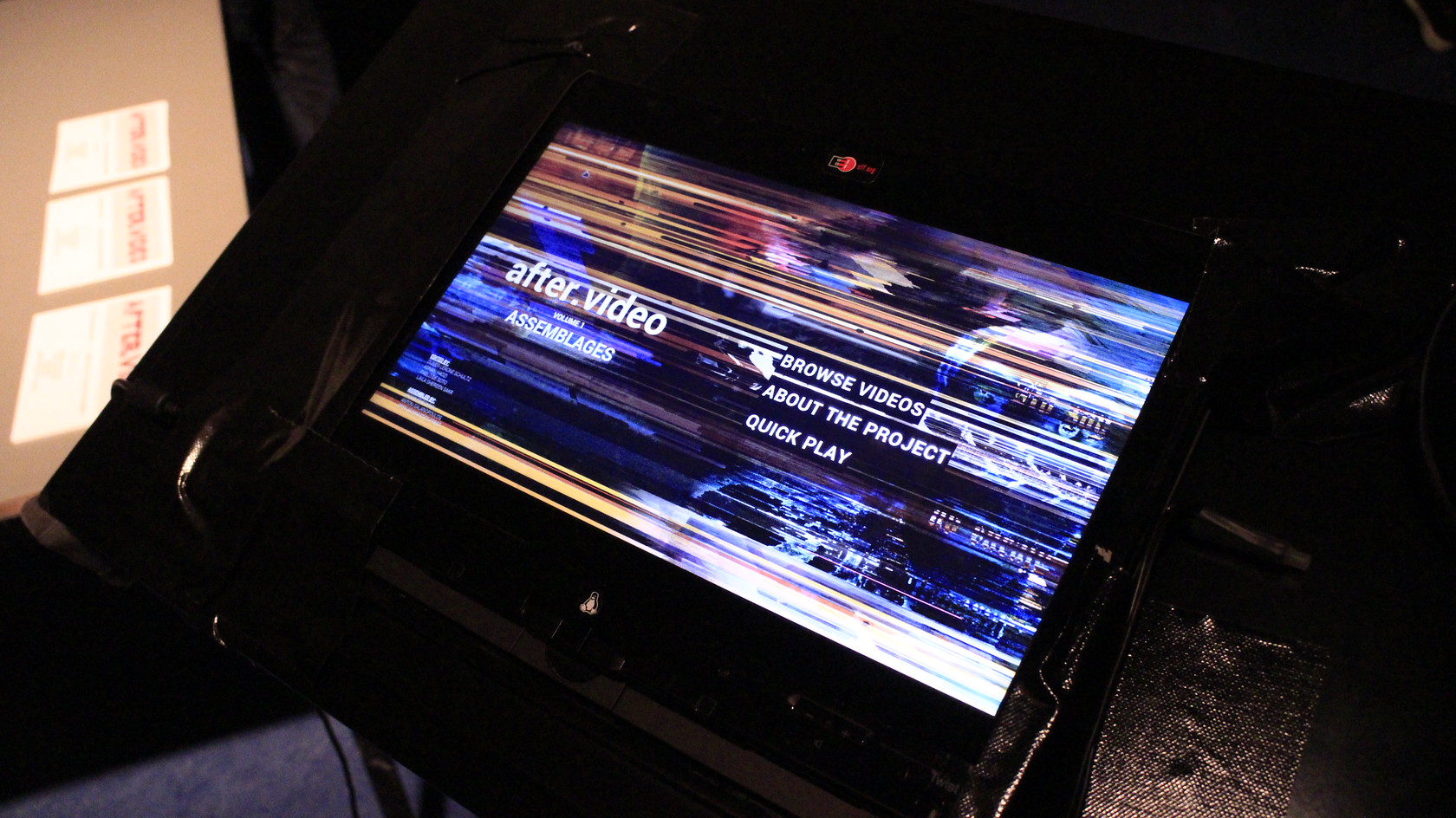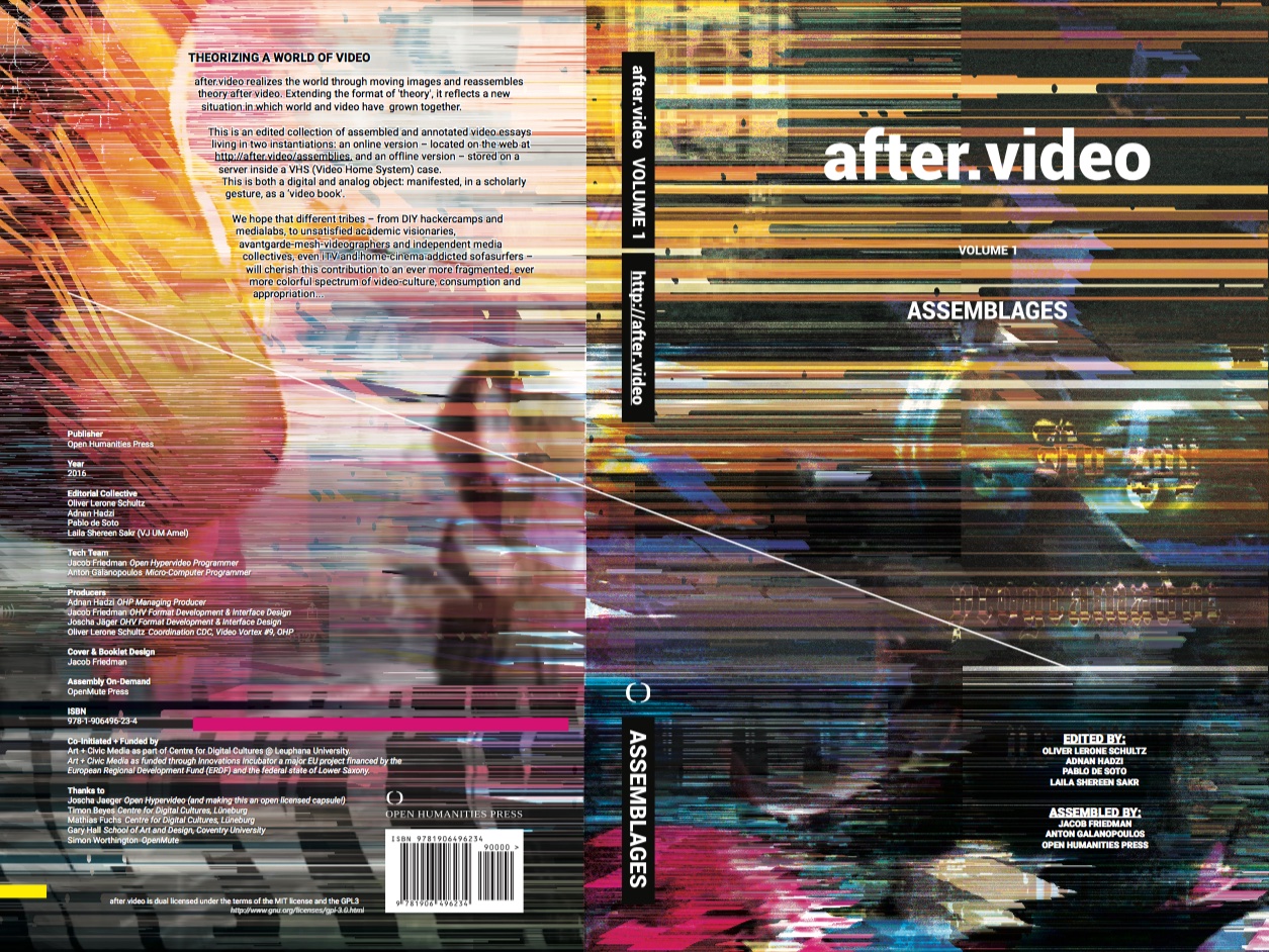 "after.video realizes the world through moving images and reassembles theory after video. [...] This is an edited collection of assembled and annotated video essays living in two instantiations: an online version – located on the web at http://after.video/assemblages, and an offline version – stored on a server inside a VHS (Video Home System) case. This is both a digital and analog object: manifested, in a scholarly gesture, as a 'video book'." It is the first use case of "Open Hypervideo" before the FrameTrail environment was released. after.video is published by Open Humanities Press under the terms of the MIT and GPLv3 licenses (ISBN: 978-1-906496-23-4).