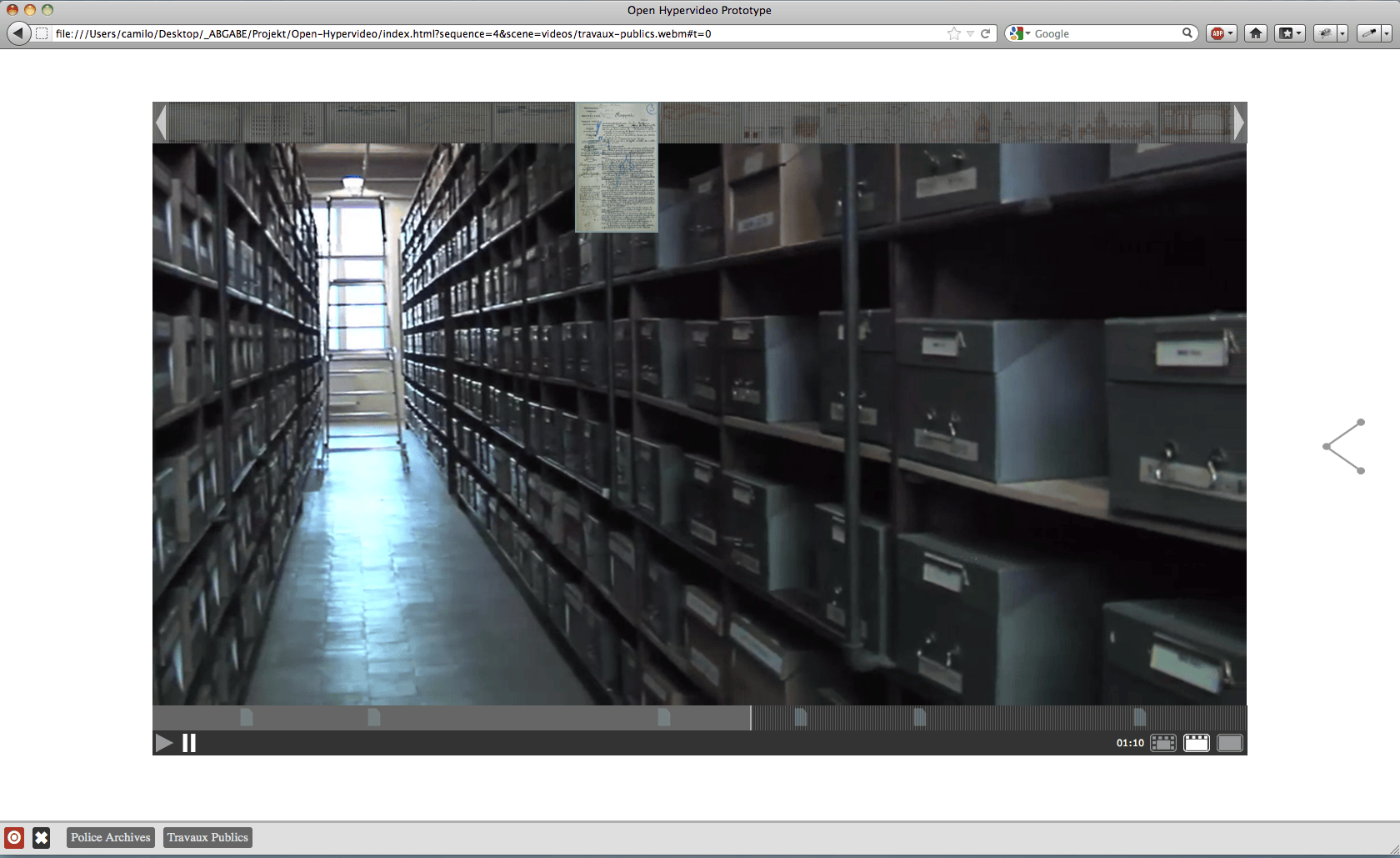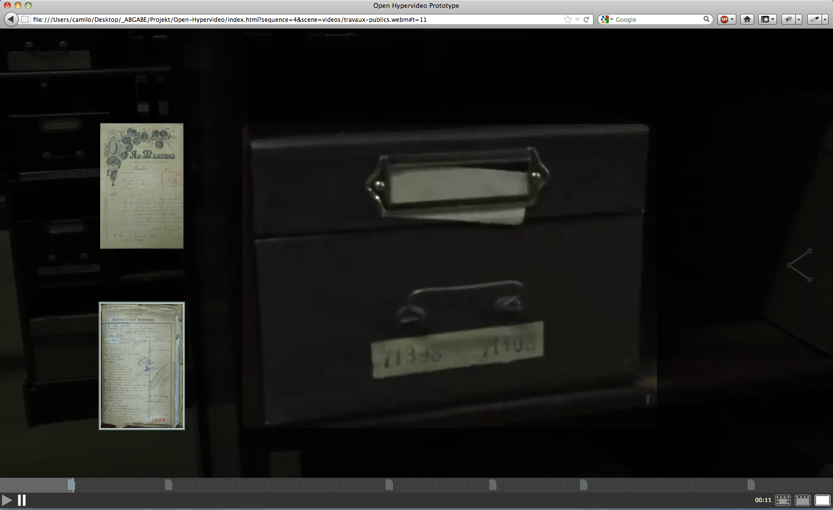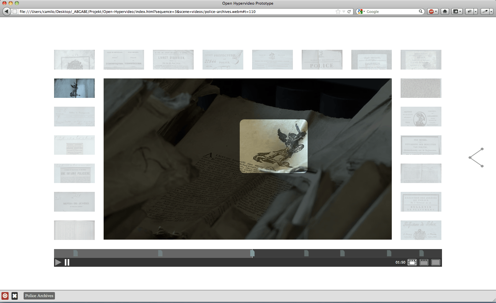 The project aims to re-visualize the document context within the archive, as well as the invisible connections in between archival records (the archival methodology). The overall idea is to use film fragments as organizational structure for the archive of annotated documents. First ideas for this project have emerged within several semesters of research and experiments within the fields of interactive film and archives under the supervision of Prof. Mario Doulis (Merz Akademie). The prototype is continously being improved and developed further in different follow-up projects (more info can be found at the Open Hypervideo Project Homepage).