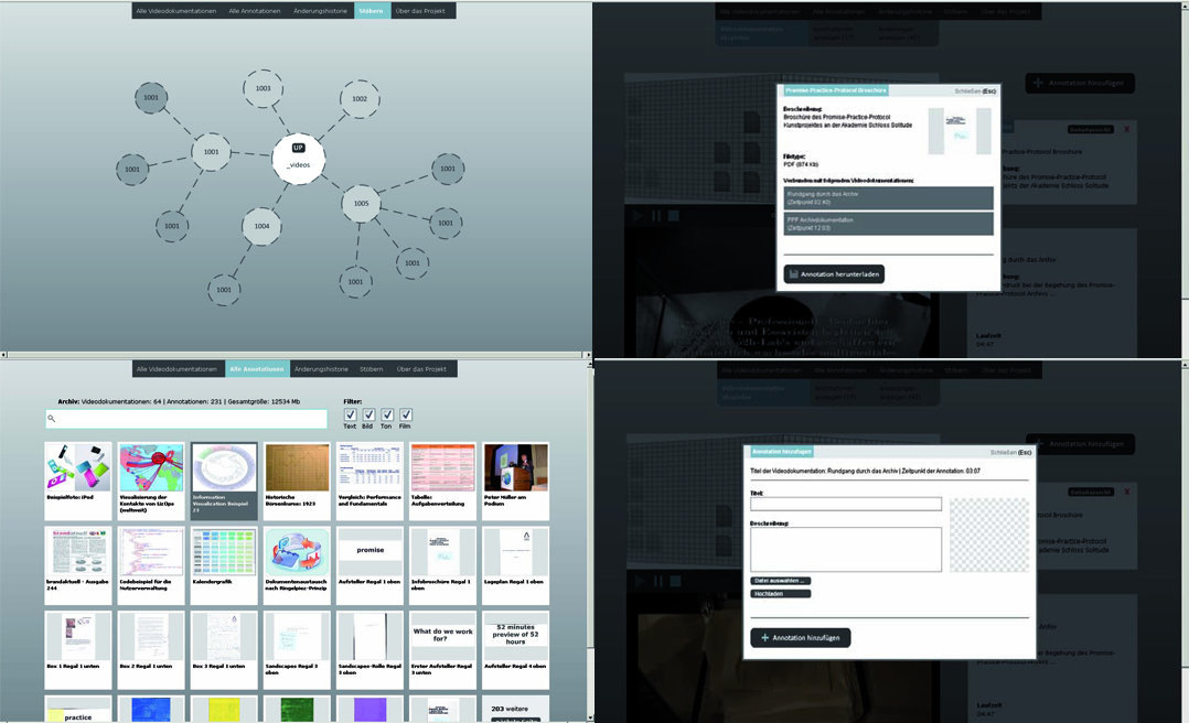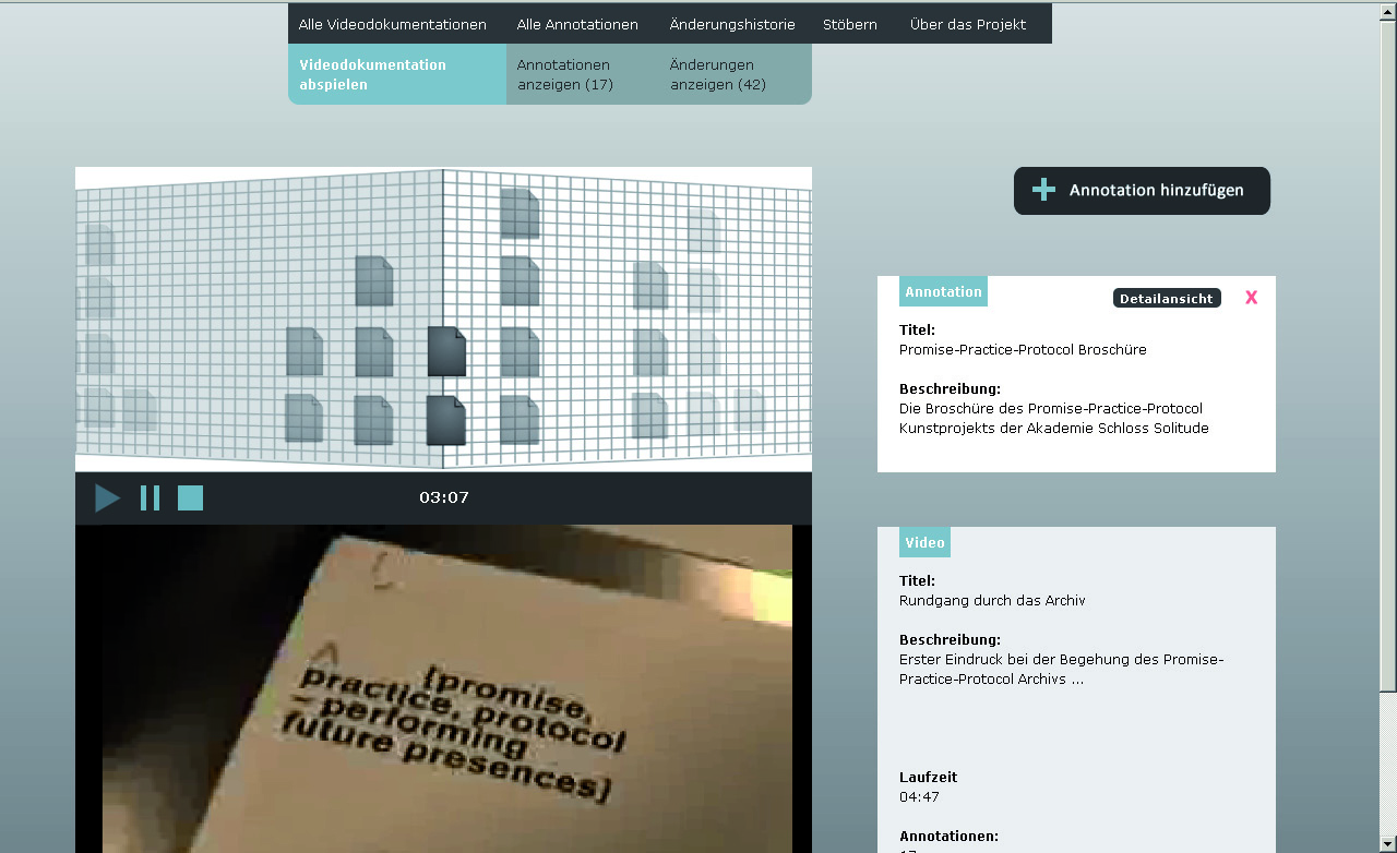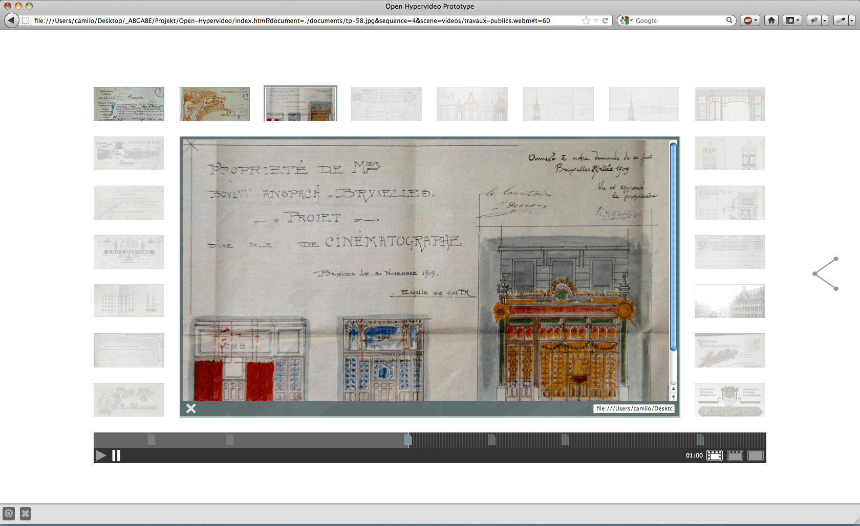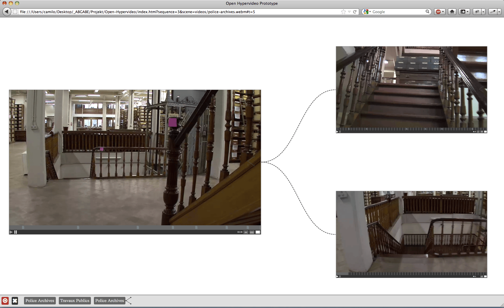 The project aims to re-visualize the document context within the archive, as well as the invisible connections in between archival records (the archival methodology). The overall idea is to use film fragments as organizational structure for the archive of annotated documents. First ideas for this project have emerged within several semesters of research and experiments within the fields of interactive film and archives under the supervision of Prof. Mario Doulis (Merz Akademie). The prototype is continously being improved and developed further in different follow-up projects (more info can be found at the Open Hypervideo Project Homepage).