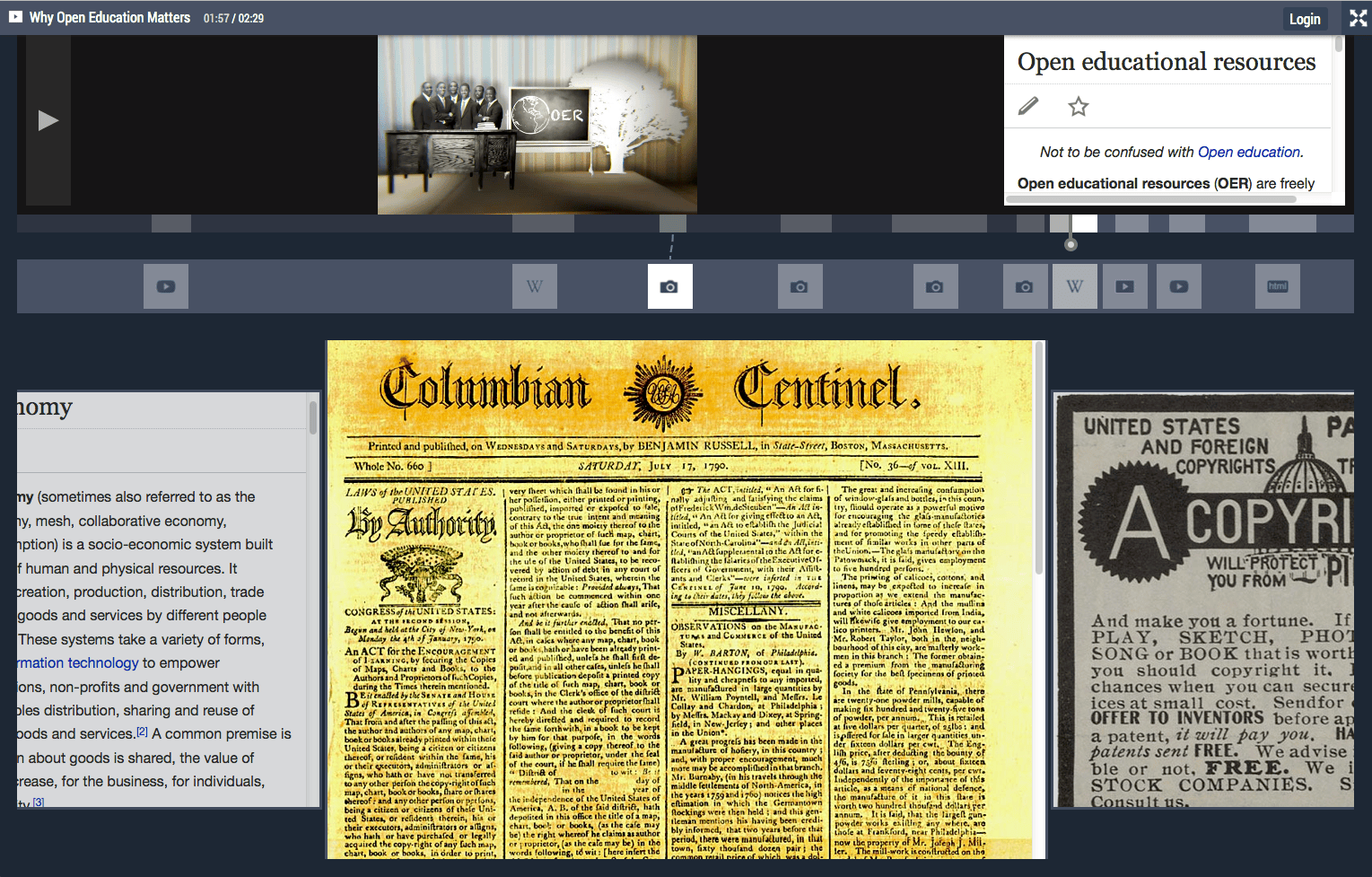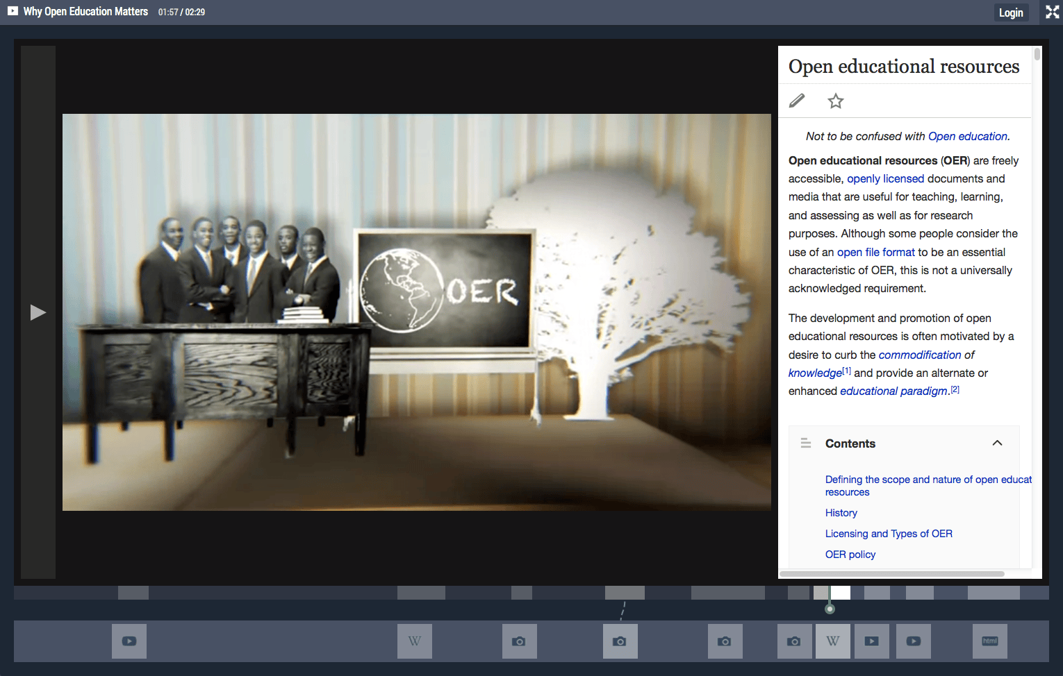 HIRMEOS Hypervideo turns a three-minute explainer animation on the conceptual, economic, and technical challenges of Open Access monograph publishing into an interactive hypervideo. Produced for the EU Horizon 2020 project HIRMEOS (High Integration of Research Monographs in the European Open Science infrastructure), the video is enriched with FrameTrail: an interactive transcript runs alongside the player while four curated collections — Partners & Platforms, Services & Tools, Open Access Basics, and Scientific Publishing — surface hyperlinks, encyclopedia entries, and PDF monographs exactly when the narration touches the topic.