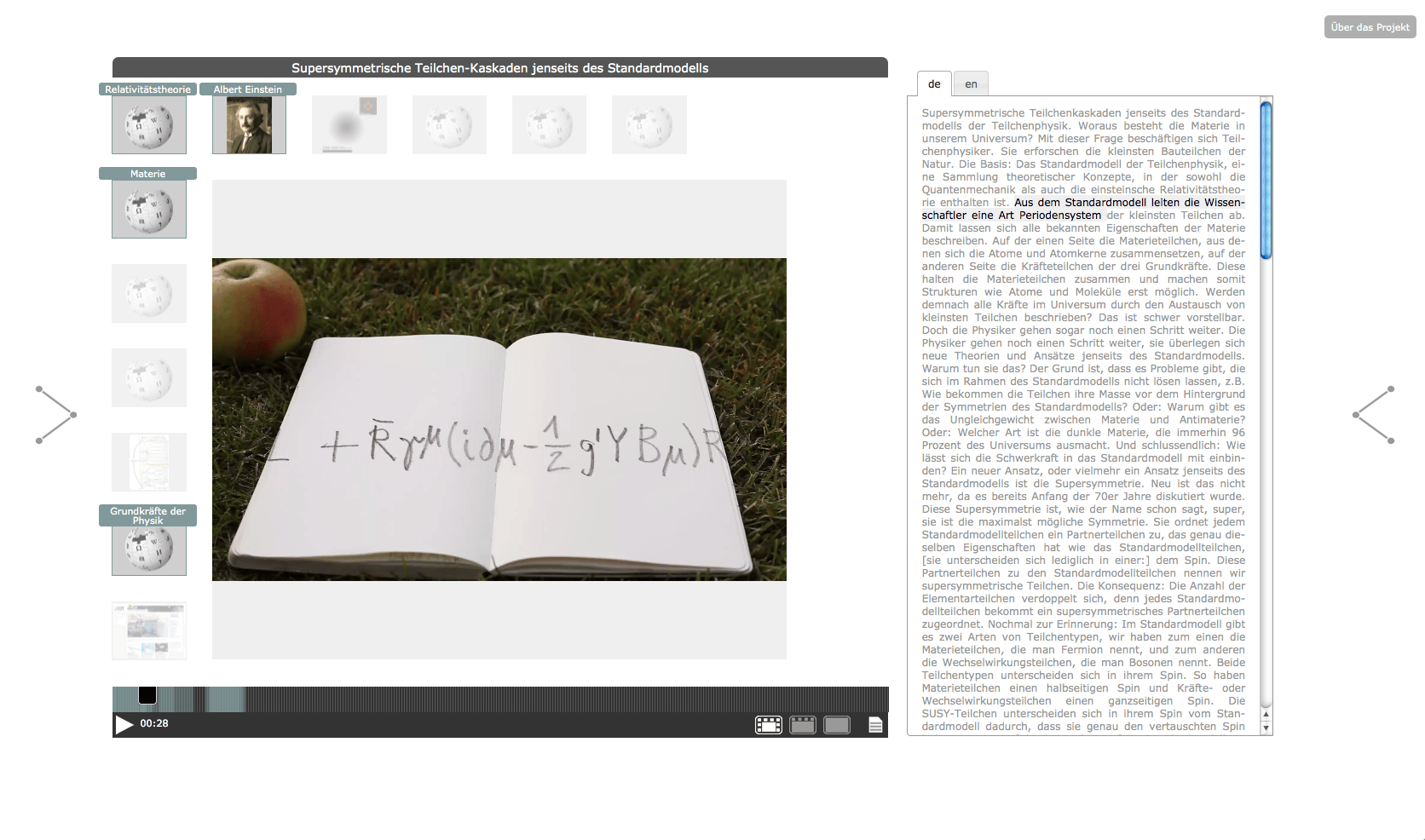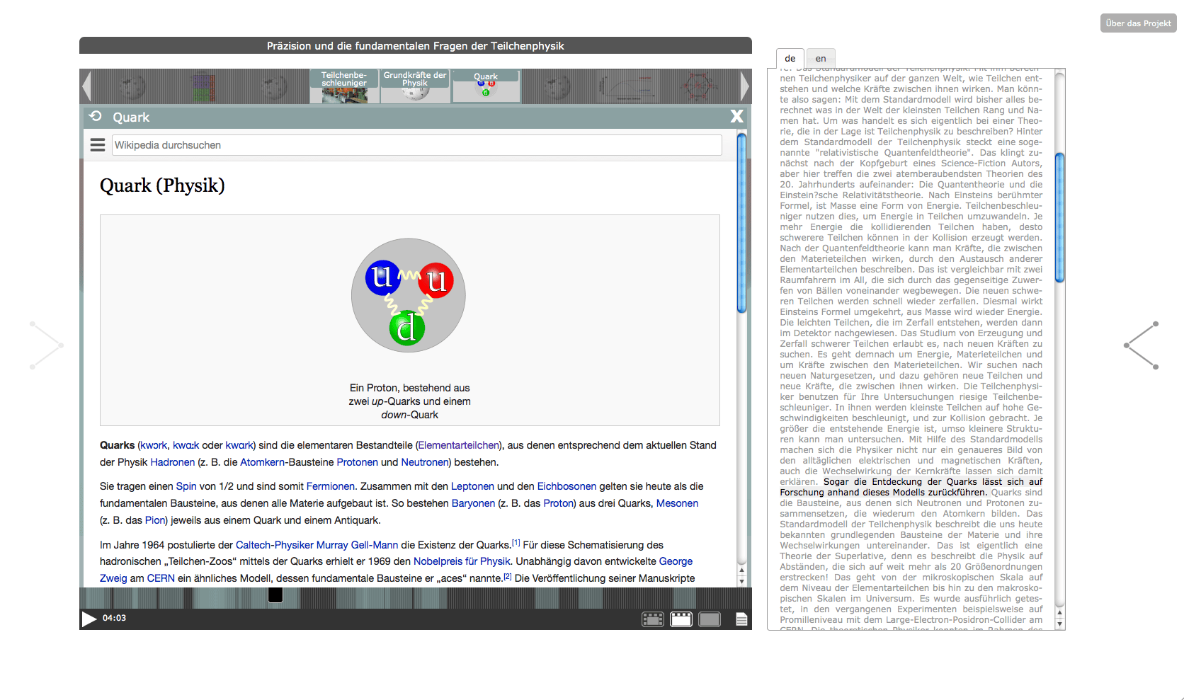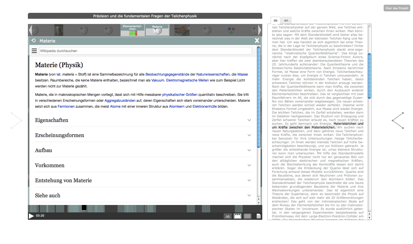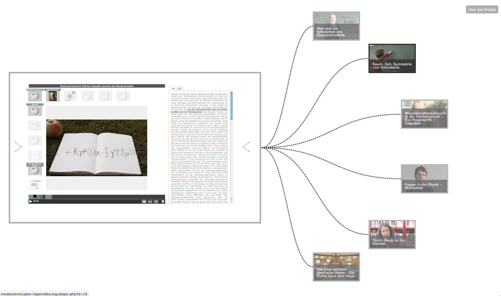 The "Knowledge Space - Elementary Particle Physics" has been developed in 2012 within the framework of the project "Public Science and Digital Knowledge Spaces". The project was a cooperation between the ZAK | Centre for Cultural and General Studies at Karlsruhe Institute of Technology (KIT) and Merz Akademie Stuttgart, with funds from "Kreativitäts- und Innovationsring Baden-Württemberg". For the project, the existing Open Hypervideo Player has been improved both in terms of usability and project-specific functional requirements.