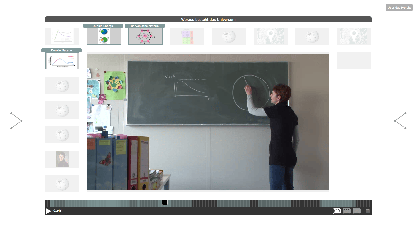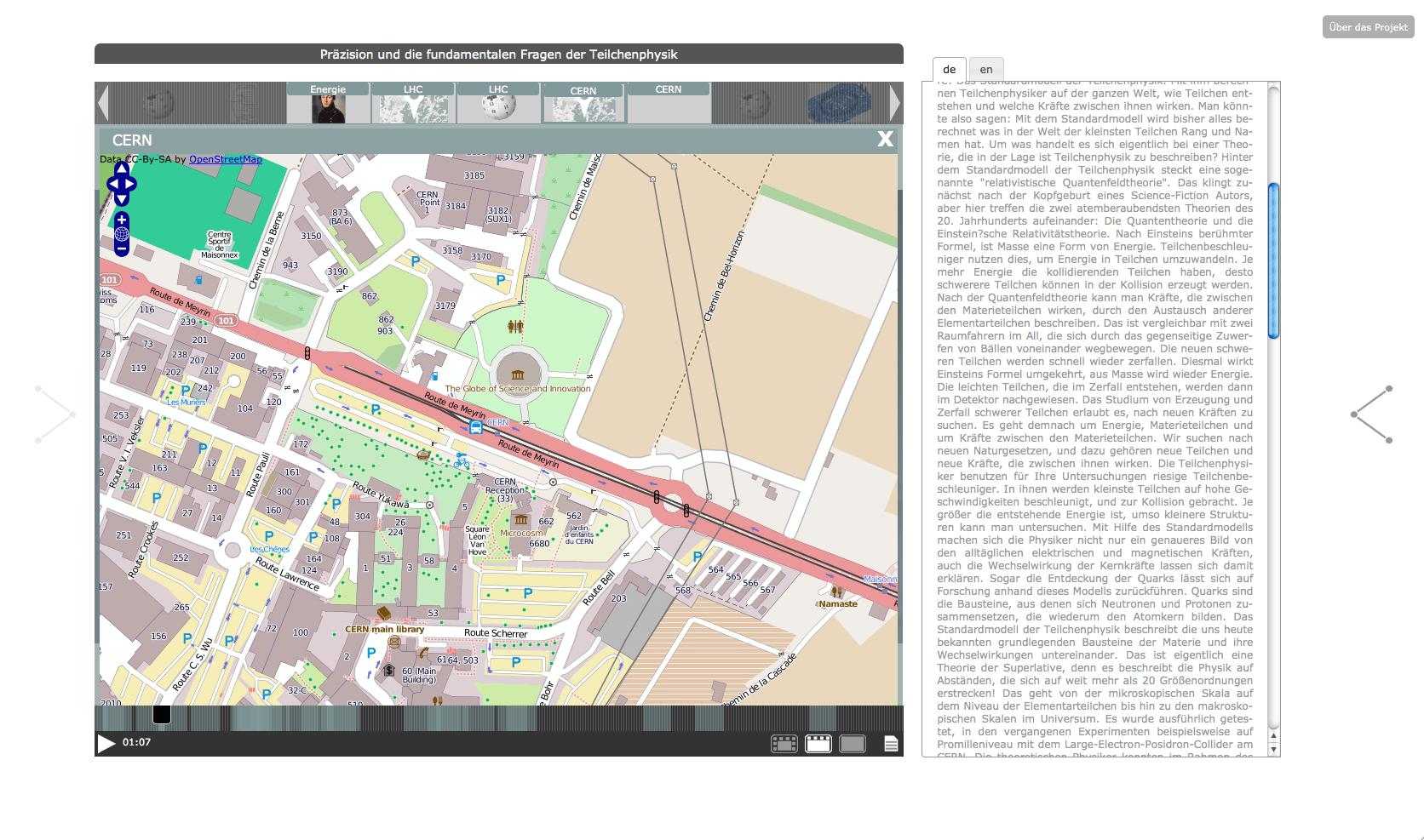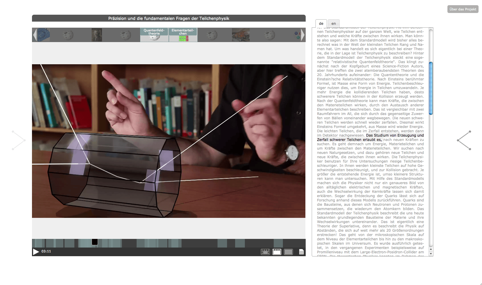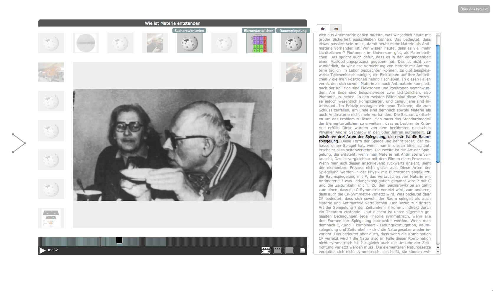 The "Knowledge Space - Elementary Particle Physics" has been developed in 2012 within the framework of the project "Public Science and Digital Knowledge Spaces". The project was a cooperation between the ZAK | Centre for Cultural and General Studies at Karlsruhe Institute of Technology (KIT) and Merz Akademie Stuttgart, with funds from "Kreativitäts- und Innovationsring Baden-Württemberg". For the project, the existing Open Hypervideo Player has been improved both in terms of usability and project-specific functional requirements.