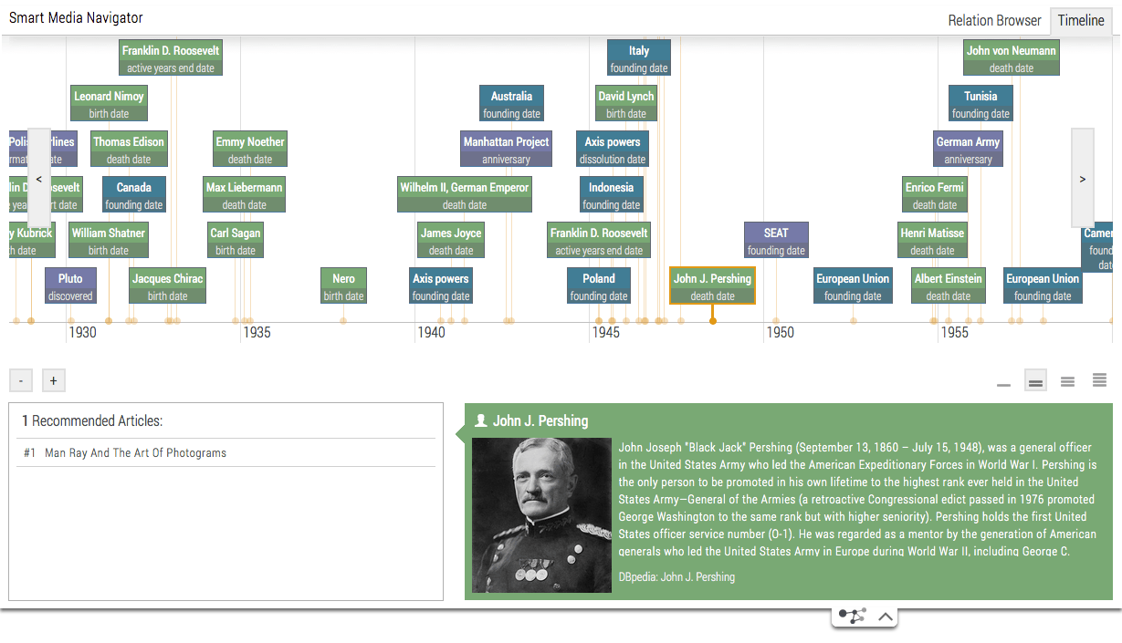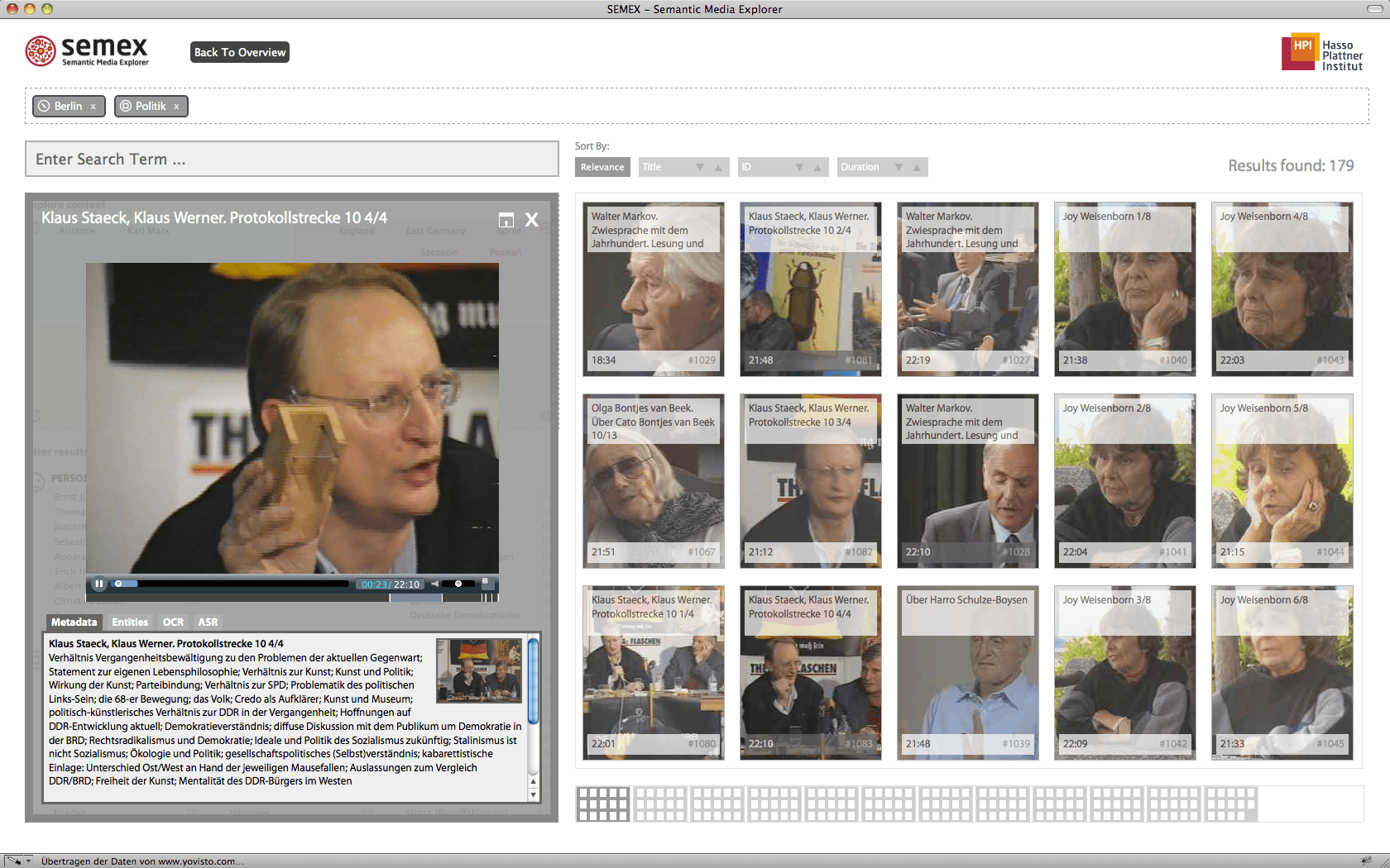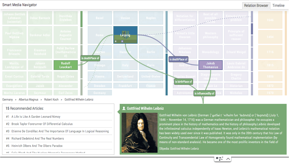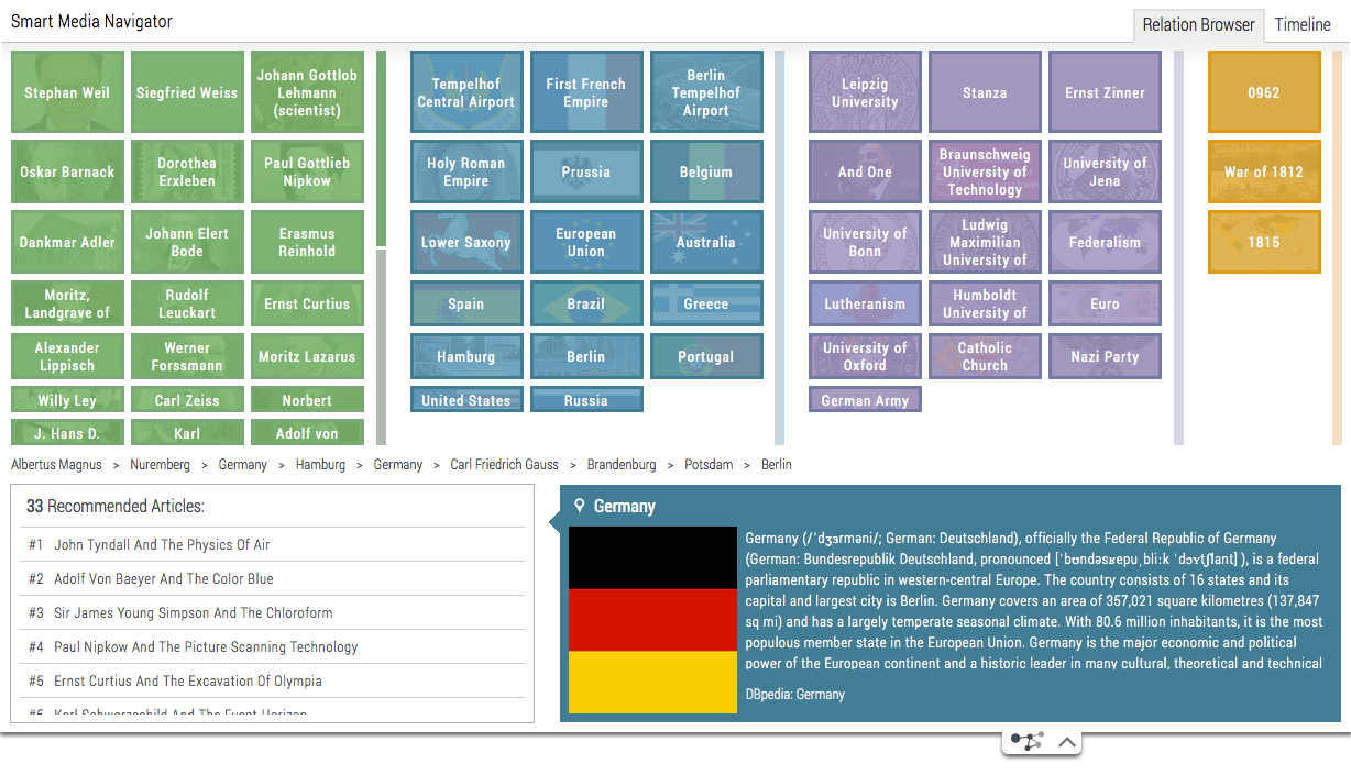 The cultural memory is storing an increasing amount of information and data. Yet, at present, only a negligible portion of these contents is searchable or available via digital channels. Taking media archives into the digital future, the mediaglobe project aims at providing digital availability and usability for the growing stock of audiovisual documents concerning German contemporary history. The Semantic Media Explorer combines the latest media analysis processes, such as automatic scene segmentation, intelligent character recognition, and the ability to recognize genres and faces in videos. The information extracted via the media analysis is correlated using semantic information so that users can identify new links and "rummage around" in the multimedia content. mediaglobe has been promoted from 2009 - 2012 by the Federal Ministry of Economics and Technology within the framework of the research programme »THESEUS – New Technologies for the Internet of Services«.