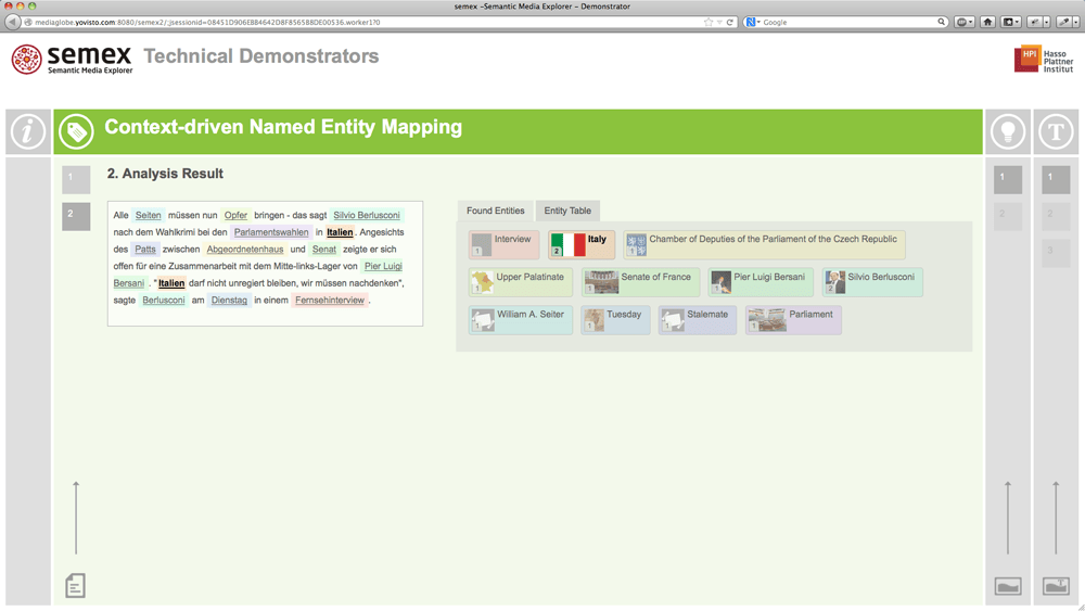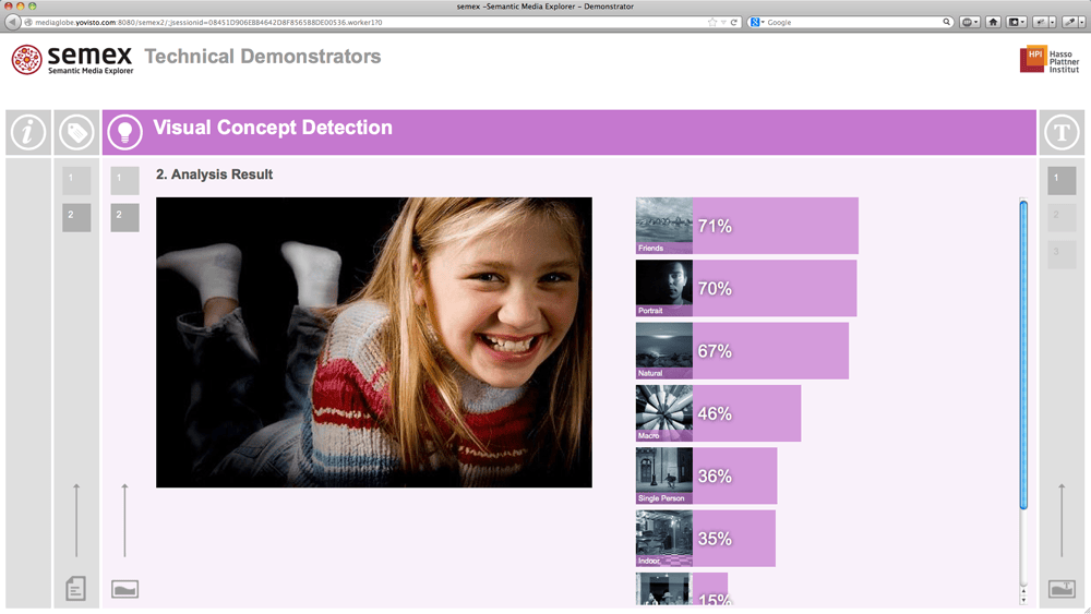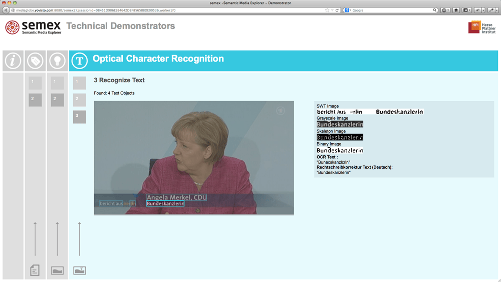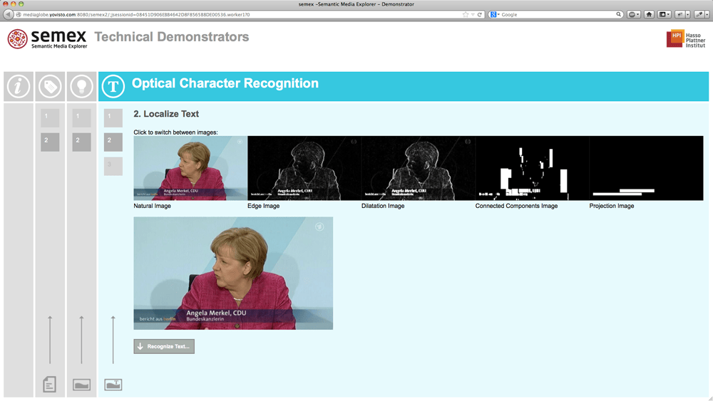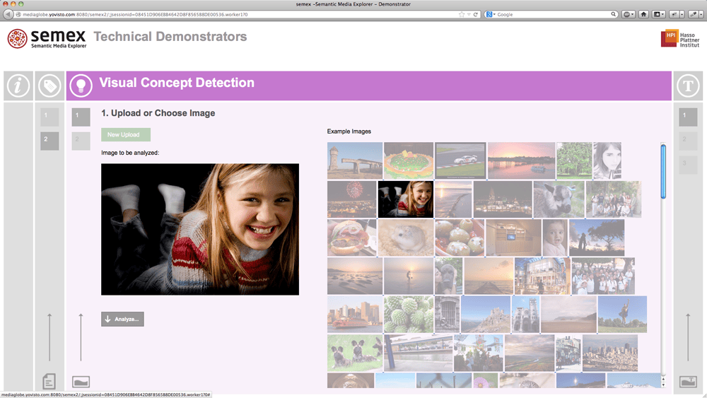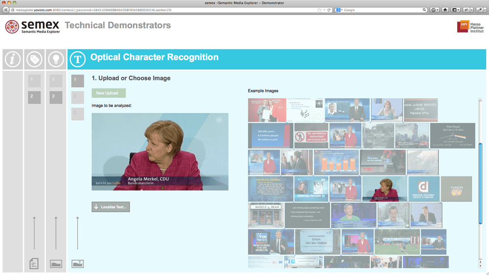 Demo-Application of the Semantic Media Explorer (semex) technologies developed at Hasso Plattner Institute (HPI). The web application enables live-analysis of text and images by means of Named Entity Recognition (NER), Visual Concept Detection (VCD) and Optical Character Recognition (OCR).