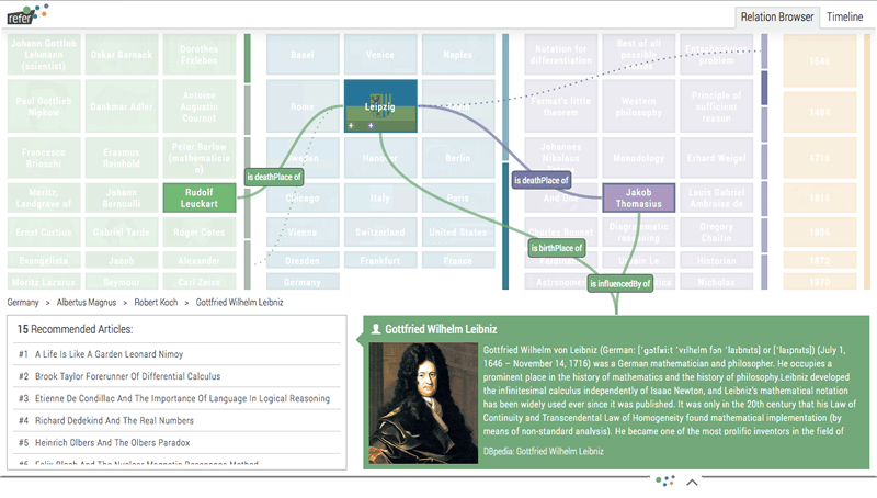 refer is an online-recommendation system based on Linked Open Data and Semantic Web Technologies. It aims to improve the user's and author's experience while curating and navigating in blogs, multimedia platforms, and archives. It thus helps broadcasters, journalists, archives and companies to combine traditional image, audio and video data automatically. refer was created by Tabea Tietz, Jörg Waitelonis, Joscha Jäger and Christian Hentschel in a one year innovation project funded by Media Innovation Center (MIZ) Babelsberg.