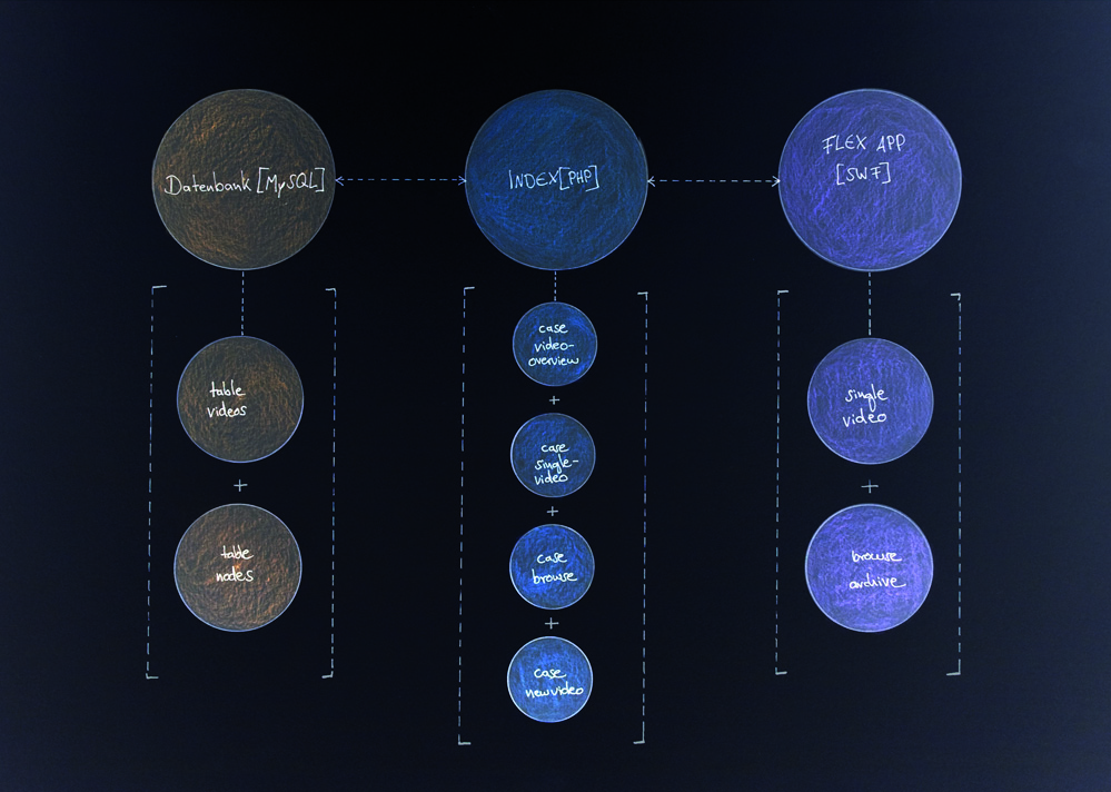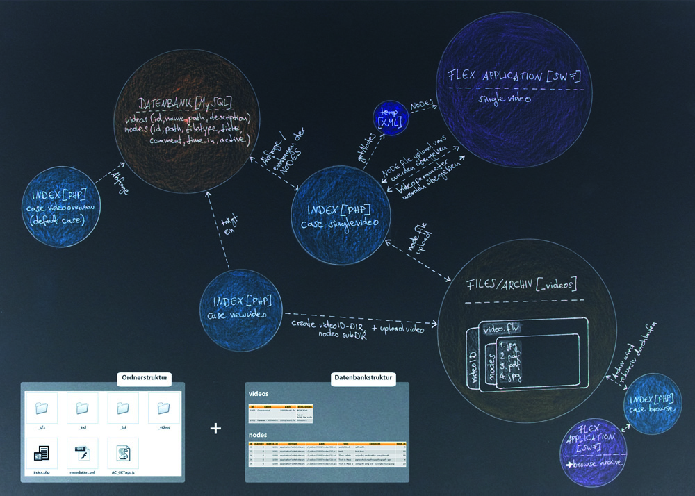 The video-based archive was created within a course by Prof. Mario Doulis. During the course I developed the first ideas for follow-up projects that dealt with annotated film. The basic concept is to use interactive videos as an interface to a document archive. In the Webinterface, documents are visualized in something one could describe as a timebased "virtual bookshelf". Technically the project was implemented with PHP and MySQL, with an Adobe Flex Application as the frontend.